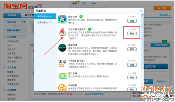 2)、如果工作臺中無“寶貝關聯本地商戶”的模塊,則可到右側的“添加免費模塊”中添加。添加成功后,賣家中心工作臺就會出現上圖的關聯商戶模塊。