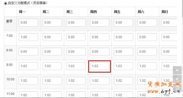 看上圖紅色框,我們填了“1.03%”就代表了我們把店里的1.03%的寶貝設置在周四9點-10點均勻上架,該時段上架的寶貝數量為=寶貝總數×1.03% 如果您家有1000個寶貝,那在該時段上架就是10個寶貝了。
