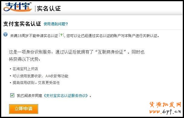 第三步:確認(rèn)您自己是否已經(jīng)滿18周歲,并同意《支付寶實(shí)名認(rèn)證服務(wù)協(xié)議》;