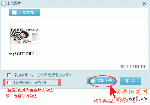 5、左下角會(huì)默認(rèn)勾選壓縮尺寸,請不要勾選這樣的選項(xiàng)。操作好了點(diǎn)“立即上傳”: