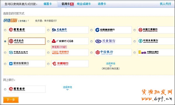 1、進入收銀臺,選擇在【信用卡】頁面下,點擊“快捷支付(含卡通)”的【中國銀行】——【下一步】;