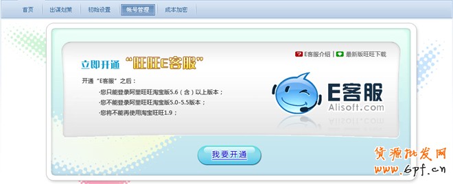 1、用戶在第一次新增子帳號前,需要開通旺旺E客服。如下圖,點擊“我要開通”按鈕即可: