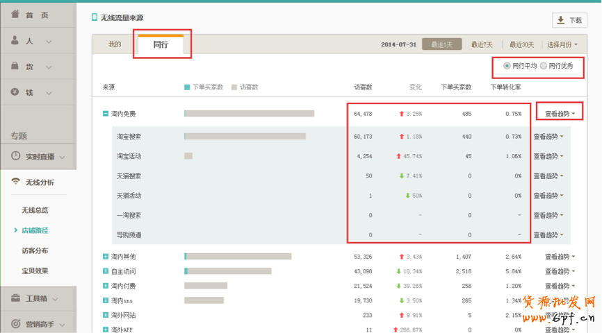 1)無線流量來源主要提供我的無線流量來源效果數(shù)據(jù)及趨勢,并提供同行平均、同行優(yōu)秀數(shù)據(jù)進行對比: