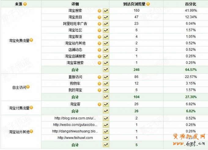 從上面數據可以進行依次分析。其實每天下午8點左右差不多可以看看這個了,也不需要太長時間,心里有數了,才知道哪一塊的推廣需要加強。由上面的圖可以看出,來自淘寶搜索的流量最多,占比最大。其實我個人覺得,自然搜索流量很重要,從數據也可以看出,做好寶貝優化,引導自然搜索的占比,還是很重要的,并不是付費流量就一定不錯。數據統計也反應出了其他的問題,比如幫派流量比較低,說明我近期把幫派問題落下了,沒有細心打理幫派。淘寶站內其他包括很多,比如友情鏈接等。只有有流量,說明這部分還是有點修效果的。關于店鋪動態,其實你可以利用好自己,我的淘寶的個人主頁,這是給自己的好友,粉絲展現的比較不錯的場所。自主訪問部分,大多數是回頭客,這部分你可以分析下,人數還是不少的,說明您的售后不錯,或者寶貝他們很喜歡。大家可以發現,我的數據淘寶站外其他也有流量,但是比較少,說明站外引導做的還是不夠細致的。有新浪博客的,有微博的,也有其他網站收錄的。說明我需要增強一下站外引流,這也是流量的重要來源之一,不可小覷。