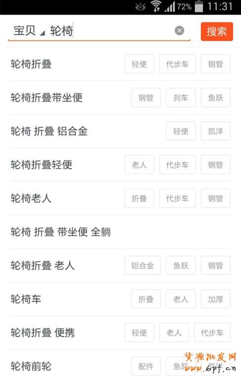 我們可以看到,搜索出來的產品標題都是帶有鋼管這個詞的,那么同樣搜索輪椅,點擊:輪椅折疊 輕便