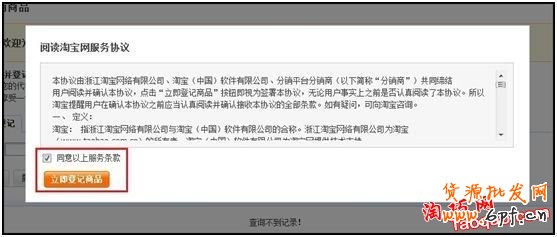 1、閱讀淘寶網服務條款,點擊“立即登記商品”。