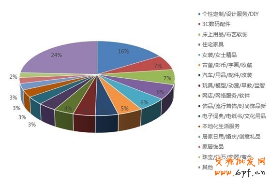從2011年和2012年的數據來看,定制類目的交易總額和PV、UV在增長,顯然買家對定制的搜索和興趣在增加,但定制商品占全網比例約為1%。目前,淘寶帶有“定制、訂制、定做、訂做”的商品數達到萬件,122個葉子類目下定制商品數在1萬件以上。從下面的定制商品類目占比圖來看,3C數碼配件、床上用品占7%,個性定制占到了16%。從目前定制商品賣家來看,一部分有潛在定制能力的賣家仍未發現商機,而已經在做定制的賣家還不夠成熟,商品品類和規模遠遠無法滿足消費者的多樣化、個性化需求。綜上可看出,無論在消費力,還是賣產家發展空間上,定制市場都存在很大的潛力。