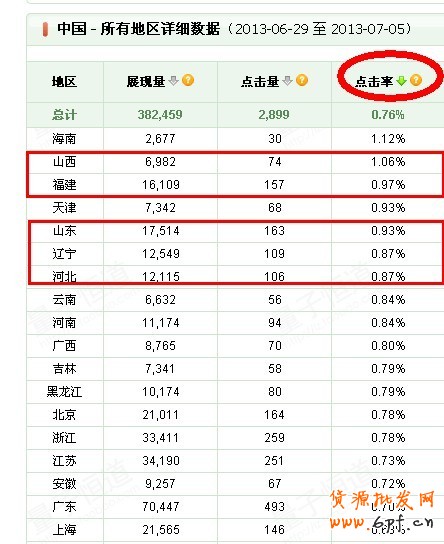把點擊率從高到低排,找出近期展現量相對大,而點擊率又相對高的幾個地域,如上圖紅框標注的5個地域: 山西 福建 山東 遼寧 河北,平均點擊率0.8%以上。