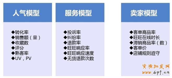 以上淘寶最基礎(chǔ)的六個(gè)模型,下面我們講一下影響店鋪搜索權(quán)重最核心的3個(gè)模型:賣(mài)家模型、服務(wù)模型和人氣模型。