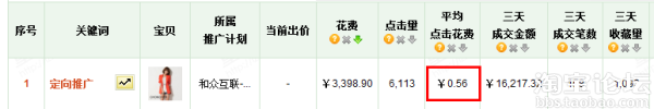 出價0.4,每天點擊量有13000個點擊,平均點擊花費0.39.定向出價0.4就能引來那么大的流量,所以說這款寶貝的隱性質量得分非常的高。