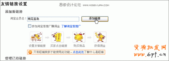 出現下面設置頁面,對應在“淘寶會員名”中,填寫如好友的會員名,一定注意是開店的那個“旺旺號”,點擊添加鏈接后,你就可以看到對方店鋪名就出現到下面已有鏈接了!