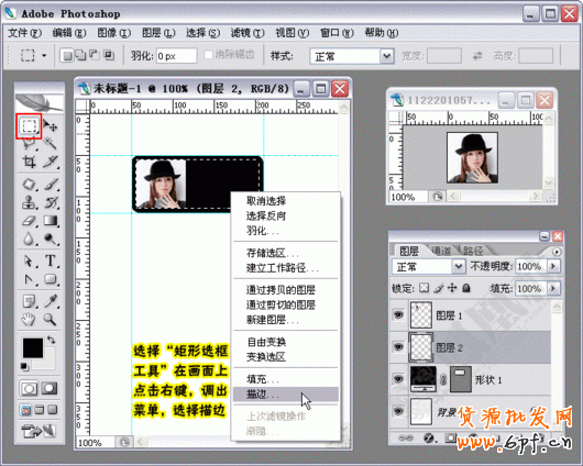 9.選擇“矩形選框工具”在畫面上點擊右鍵,調(diào)出菜單,選擇描邊。