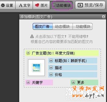 ⑶功能模塊中,圖文廣告和功能模塊兩個最常用,圖文廣告好處在與可以添加連接,也就是說,只要顧客點擊圖片或文字就會連接到商品所在的頁面,這一功能方便顧客迅速購物,功能模塊中中有阿里旺旺的的連接功能,只要設置上你的阿里旺旺名稱,顧客點擊的時候就會直接開啟阿里旺旺聊天窗口,方便顧客聯系賣家,好處不用多說。