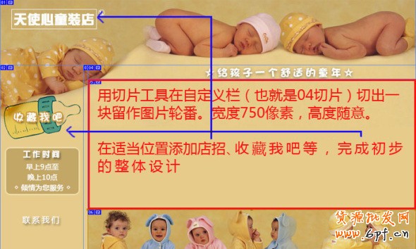 調整好圖片位置后先做些整體的設計,如加入店名、收藏我吧、工作時間等,也可以在適當的位置添加圖片,自我發揮吧。需要提醒的是,此步僅作靜態的設計,動畫設計等請不要在這步做出,待下面存儲為獨立的“店招”、“左側欄”和“自定義促銷欄”PSD文件后再編輯。