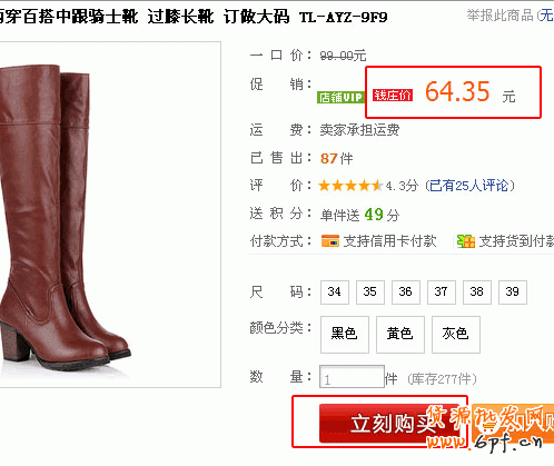 4.點擊按鈕后,進入賣家店鋪的商品頁面,然后選好寶貝的詳細信息,點擊“立刻購買“按鈕,如圖下所示。(接下來的流程跟在淘寶購買其他寶貝的流程基本一致)