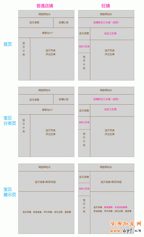 旺鋪是需要花錢升級才能使用的,所以它必然比普通店鋪有一定的優勢,優勢區別體現在哪里呢?請看頂部的店鋪頁面結構對比示意圖。從圖中所展示的頁面表現可以看出,普通店鋪和旺鋪的最大的差別是:旺鋪多出了可供店主自定義的模塊,普通店鋪只能使用固定模板。下面將按頁面分別介紹它們的異同: