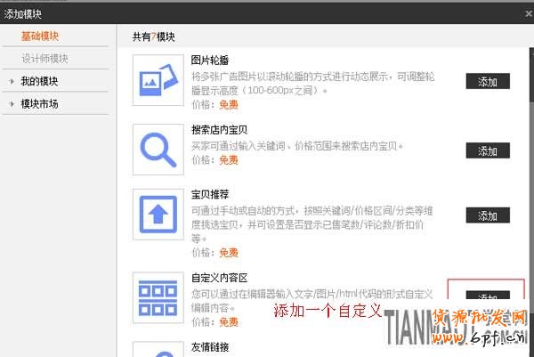 在出現(xiàn)的選擇選項(xiàng)中,選擇“自定義模塊”,點(diǎn)擊“添加”。