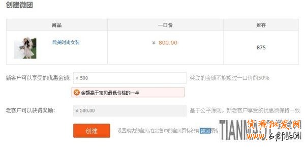 參團人享受的折扣是通過發(fā)放微團專用的寶貝優(yōu)惠券的方式實現(xiàn)的,設置金額不能高于商品最低價格的一半。發(fā)起人返利金額與參團人優(yōu)惠券金額一致,不需要填寫。點擊創(chuàng)建后,即可發(fā)布成功。