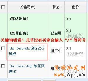 大家看下面這個例子:存在很多問題。第一,類目出價未啟用;第二,關鍵詞出價全部都是0.1;第三,關鍵詞太少;第四,關鍵詞都過于精準。