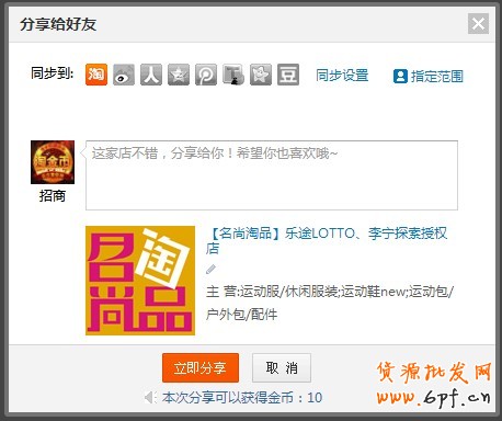 現在,“分享店鋪送金幣”和“分享寶貝送金幣”可以用起來啦~,讓買家幫你把店鋪分享進他的SNS網絡,拉動他人際網中的朋友來你店鋪逛逛、消費,相當于熟客帶朋友的銷售模式啊~動心不~
