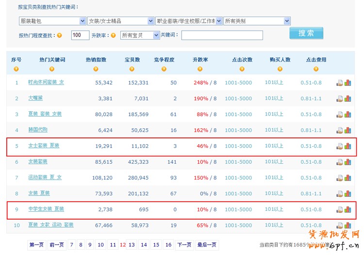 我 店里主營(yíng)的是休閑套裝,風(fēng)格是韓版的,比較適合16-25歲的女孩。掌柜得非常了解自己的產(chǎn)品,才能優(yōu)化出好標(biāo)題。大概10天前,我在熱門關(guān)鍵詞排行榜發(fā) 現(xiàn)了幾個(gè)好詞,下圖中紅色方框中就是好詞哦!搜索條件我選了高速上升,表示近期搜索量增大的。我們來(lái)看看“中學(xué)生女裝 夏裝”這個(gè)詞,寶貝數(shù)很少,點(diǎn)擊量卻很高,銷量也不錯(cuò),近期高速上升的,馬上收入囊中,同行可別發(fā)現(xiàn)呀,嘿嘿。。。