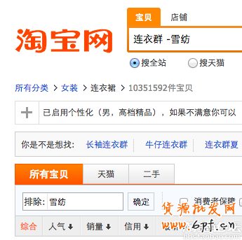 使用方法:輸入 關(guān)鍵詞 -tmall . 如:連衣裙 -tmall