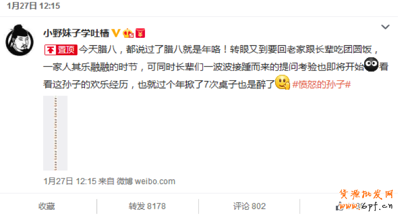 2015年1月末,微博知名博主@小野妹子學吐槽 以百草味年味禮盒為漫畫素材, #憤怒的孫子#為話題發布了三個系列惡搞漫畫段子。