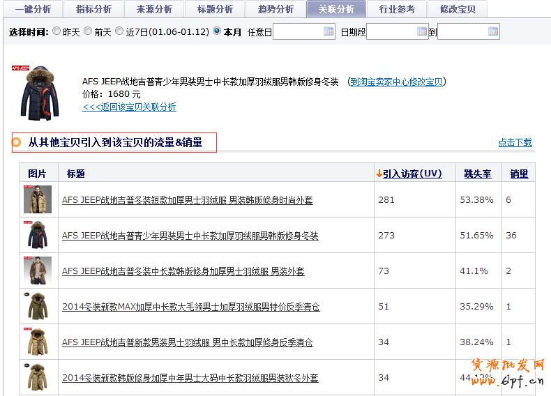 分析寶貝與其他寶貝的流量關系,包括該寶貝給其他寶貝引入的流量,其他寶貝給該寶貝引入的流量,確定該寶貝與其他寶貝的流量走勢,設置搭配銷售,提高店鋪客單價。