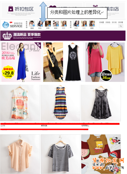 我們可以清楚的看到兩張圖的不同視覺效果,只有主次分明,特點突出的首頁才是能夠留住買家的頁面,進而增加店鋪關(guān)聯(lián)寶貝鏈接的點擊。這里掌柜們需要確定的就是自己店鋪是在怎樣的一個定位上,或者是在怎樣的一個風(fēng)格上。精確把握店鋪所要渲染的氣氛,然后根據(jù)這個大的方向去調(diào)整整體的布局劃分,讓不同屬性的寶貝更便捷的被買家搜索到,促進分類頁面的點擊。