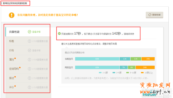 ◆寶貝效果里面的寶貝溫度計(jì)我認(rèn)為是這次更新以后對(duì)單品寶貝比較好的一項(xiàng)功能,尤其是針對(duì)一些中小賣(mài)家,運(yùn)營(yíng)能力不強(qiáng)的掌柜,這樣的功能簡(jiǎn)單明了,很直接的就能讓掌柜看出自己寶貝的問(wèn)題所在,一步到位的去發(fā)現(xiàn)問(wèn)題,給出解決建議,讓后讓掌柜或者運(yùn)營(yíng)去做出解決方案,這項(xiàng)功能也點(diǎn)個(gè)贊!