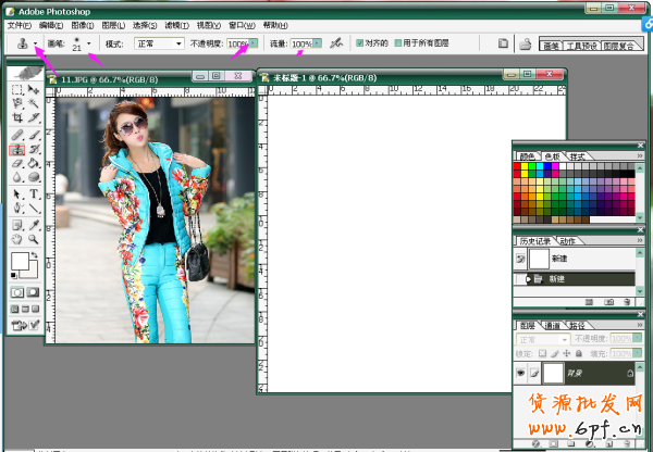 5.打開新建圖片后,點擊仿制圖章工具,把畫筆,不透明度等都設置一下。(如下圖)