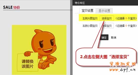 二、點擊左側特價區的大圖中“請替換該圖片”提示,按照屏幕所示,點擊“選擇寶貝”。