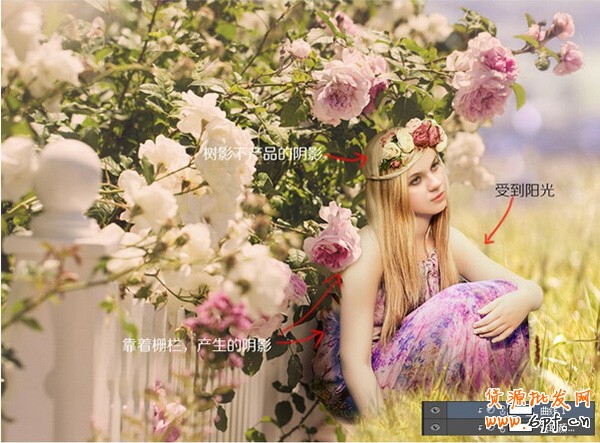 接下來是調色工作,這里需要我們的一點耐心;首先對柵欄調整光線,原本的柵欄是背光,需要調整為受天光,同時也受到后方玫瑰叢的影響形成的暗部;