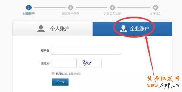 2.在注冊支付寶頁面,有“個人賬戶”和“企業賬戶”,這里選擇“企業賬戶”,賬戶名就輸入電子郵箱。