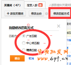因為從流量質量上來講,廣泛匹配流量最不可控,因此質量最差,中心詞次之,精確匹配的流量最可控,因此流量最好。(精準匹配的優勢是有優先展示的機會。)等到養詞完成了以后,再進行有條件的放開,修改為中心匹配,或者是廣泛匹配。具體如下圖: