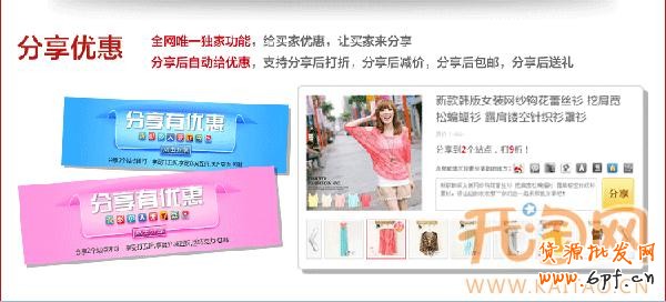 限時(shí)打折(不限時(shí)長(zhǎng),支持7折以下),團(tuán)購(gòu)(精美模版),滿(mǎn)就送,搭配套餐,包郵;自動(dòng)上下架,自動(dòng)櫥窗;買(mǎi)家分享自動(dòng)給優(yōu)惠;微博推廣,郵件推廣;支持在店內(nèi)開(kāi)展試用活動(dòng);提高流量,客單價(jià),客戶(hù)粘度;美化店鋪等等,功能很強(qiáng)大,而且是免費(fèi)的。