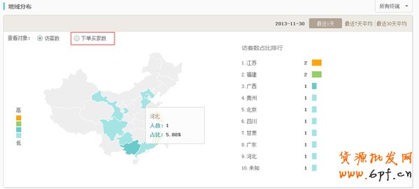 訪客分布,就是訪問你的店鋪顧客的IP地址,注意看紅色框框的位置,要提醒的是下單買家數的地域分布,至于有什么用相信開過車的親們能會恍然大悟。