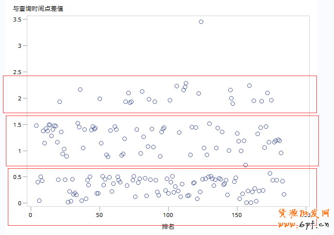 這邊縱坐標的1,已經是代表了1天,因為這個詞的寶貝數比較少,已經不能把日期看做一個離群值來考慮了。可以看到,這邊明顯分為3個層級,在一天到一 天半之內的時間,也是可以上首頁的,那我們是否也可以考慮,把這三個層級分下,看看具體他們寶貝有什么區別,也可以作為我們排名靠前該怎么做的一個依據。
