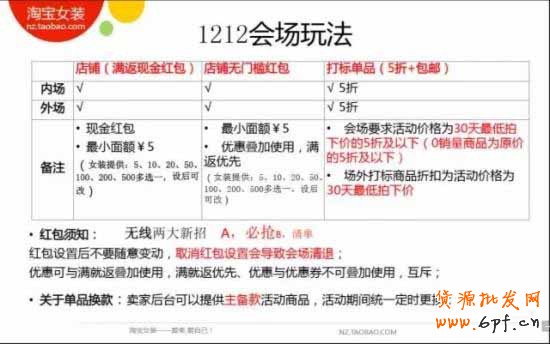 再來看看今年雙十二的會場,對外推廣會有一些特色會場,狂歡層會有橫向的做雙12的個性化嘗試,比如無限搖一搖之類,消費者的現金紅包可以全場使用,店鋪雙11是7折,雙12是5折,店鋪滿返紅包不要隨便改動。