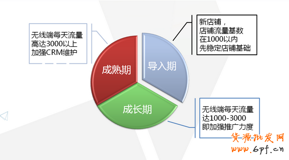 首先無線端的周期判斷也是非常的簡單。如果你的店鋪流量基數(shù)在1000以內(nèi),那么店鋪就處于導(dǎo)入期,這個時(shí)期應(yīng)該先穩(wěn)定店鋪基礎(chǔ)。如果你的無線端流量每 天可以達(dá)到1000~3000,就是出于成長期的店鋪,這個時(shí)期我們要加強(qiáng)推廣力度。如果你的店鋪無線端每天流量高達(dá)3000以上,那么恭喜你,店鋪已經(jīng) 步入了成熟期,這個時(shí)期就要加強(qiáng)CRM的維護(hù)。