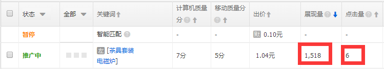 比如這個詞“茶具套裝電磁爐”首先我們看一下它的行業平均點擊率是多少,通過流量解析:這個詞PC端的平均點擊率是0.3%,它的3倍,也就是0.9%,需要的點擊量是:1518*0.9%-6=7.662。
