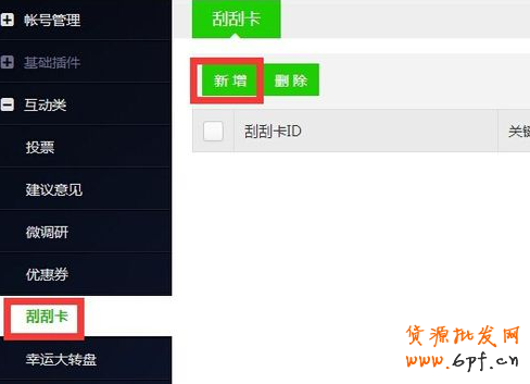 1、首先進入微信公眾平臺管理系統里面,然后在互動類里面找到刮刮卡,點擊進入刮刮卡,點擊新增按鈕,如下圖所示。