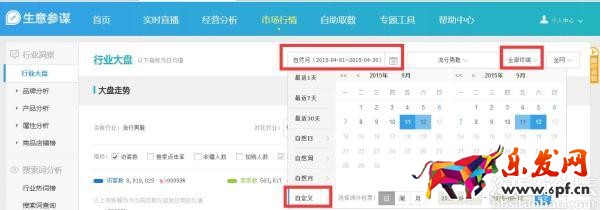 首先,市場行情大部分地方的數據在時間段選擇上提供:1天  7天  自然日  自然周  自然月  自定義時間;在平臺上分為淘寶、天貓和全網;終端上分PC端、無線端和全部終端。也就是說,市場行情提供了目前為止最全面的無線行業數據。市場行情絕大部分地方提供三年的行業數據供分析參考