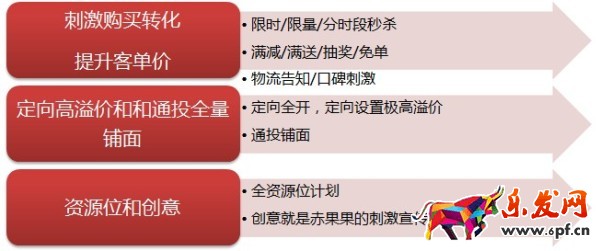 目的:雙11高潮期,通過前期用戶的蓄積,當天最主要就是刺激購買轉化,提升客單價,保持全天全時段流量持續高漲。定向溢價出到心里能承受價格,根據數據反饋及時調整。尤其是訪客定向、興趣點定向、DMP定向里的重點預熱期鉆展觸達過的客戶,包括鉆展展現過、點擊過的客戶,還有加收藏和購物車客戶,同事大流量資源位上要用通投來鋪面。如果未參加雙11會場,可提前引爆活動,用較低的成本獲取流量。