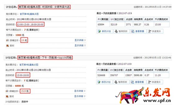 我們可以從計(jì)劃名中看到,這位掌柜把自己的目標(biāo)店鋪進(jìn)行了分類,并且在7月11號這一天在首頁4輪播焦點(diǎn)圖同一個(gè)位置上建立了不同的2個(gè)計(jì)劃。時(shí)間段是互為補(bǔ)充的。目的就在于保證獲取精準(zhǔn)流量的前提下更好的降低自己的廣告成本。