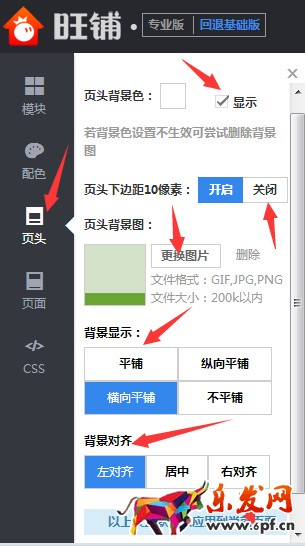 當(dāng)設(shè)置好頁頭背景圖后,得按需要設(shè)置好“背景顯示”和“背景對齊”,是“平鋪”還是“橫向?qū)R”或是“不平鋪”。