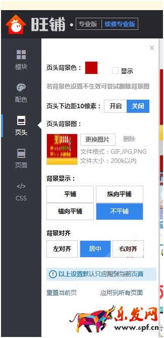 登錄淘寶賣家中心后臺,在店鋪裝修后臺的首頁,點擊左側“頁頭”,顯示的頁頭設置界面完全與之前的版本是不一樣的,2015新旺鋪裝修后臺,頂部的旺鋪標志背景是黑色的,在左側會有模塊、配色、頁頭、頁面和CSS。若你店鋪的裝修后臺是像下圖顯示那樣,那么,你的店鋪就是2015新旺鋪版本了。