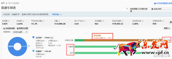 在過去30天,從成交數(shù)據(jù)占比圖看出賬戶無線端站內(nèi)關(guān)鍵詞促進(jìn)的總成交占比重,無線端促進(jìn)的總成交金額占比達(dá)到89%,從流量及總成交金額的數(shù)據(jù)占比圖可以看出,流量占比是合理的,無線端站內(nèi)關(guān)鍵詞引進(jìn)的流量能帶來轉(zhuǎn)化,從而確定接下來雙十一提流將針對無線端站內(nèi)轉(zhuǎn)化詞進(jìn)行提流,該類流量能為賬戶帶來效益。