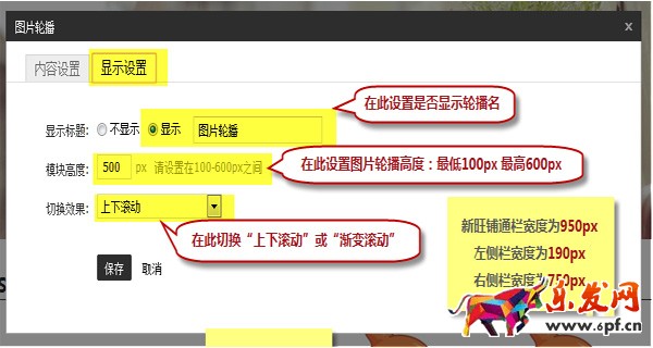 5、圖片輪播內容設置完后,點擊顯示設置,如下圖。是否顯示標題、模塊高度、切換效果。當所有操作完成后,點擊保存。