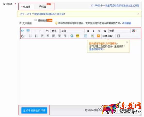 接下來再看下寶貝描述,我們需要對寶貝詳情頁進行編輯,通過下圖,我們可以看到,淘寶有自帶工具欄,可以進行字體選擇以及字體輸入等。另外這里還有生成手機版詳情,電腦端做好之后,點擊生成手機版詳情,系統就會自動生成。